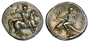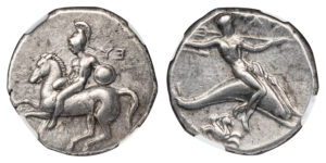 TARENTUM SILVER DIDRACHM – ISSUE OF PHINTULOS WITH NIKE CROWNING DOLPHIN RIDER – XF NGC GRADED GREEK CALABRIA COIN (Inv. 17711)