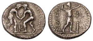 SELGE SILVER STATER – RARE WRESTLER AND SLINGER ISSUE WITH TRISKELES AND CLUB SYMBOLS – VF NGC GRADED GREEK PAMPHYLIA COIN (Inv. 20019)