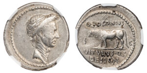 Q VOCONIUS VITULUS JULIUS CAESAR DENARIUS – POSTHUMOUS ISSUE – CHOICE VF NGC GRADED ROMAN IMPERATORIAL COIN OF THE 12 CAESARS (Inv. 21199)