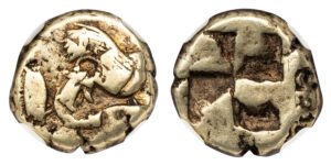 UNCERTAIN IONIAN MINT ELECTRUM TRITE – VERY EARLY TYPE WITH PELLETS – XF NGC GRADED GREEK IONIA COIN (Inv. 20342)