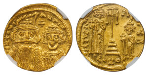 CONSTANS II WITH CONSTANTINE IV GOLD SOLIDUS – EMPERORS WITH CROSS POTENT TYPE – CHOICE AU NGC GRADED BYZANTINE COIN (Inv. 20512)