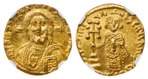 JUSTINIAN II FIRST REIGN GOLD SOLIDUS – FIRST PORTRAIT OF JESUS CHRIST ON COINAGE – MINT STATE NGC GRADED BYZANTINE COIN (Inv. 20544)