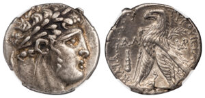 TYRE SILVER SHEKEL – YEAR 107 (20/19 BC) ISSUE PLATED IN COHEN – CHOICE VF NGC GRADED GREEK BIBLICAL COIN (Inv. 20978)