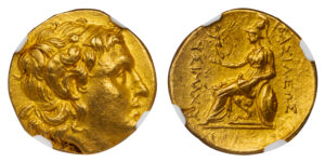 LYSIMACHUS GOLD STATER – UNIQUE VARIETY POSSIBLY OF BYZANTIUM – AU NGC GRADED GREEK THRACE COIN (Inv. 20532)