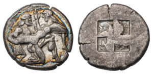 THASOS SILVER STATER – ITHYPHALLIC SATYR AND NYMPH TYPE – CHOICE VF NGC GRADED GREEK THRACE COIN (Inv. 19282)