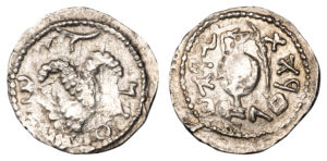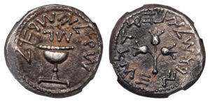 JUDAEA SILVER SHEKEL FROM JEWISH WAR – YEAR 2 RARE DIE PAIR PUBLISHED AND ILLUSTRATED IN DEUTSCH’S STUDY – XF JEWISH COIN (Inv. 21025)