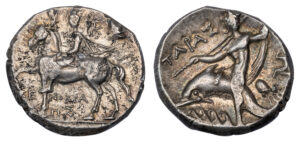 TARENTUM SILVER DIDRACHM – EARLY DOLPHIN RIDER HOLDING SQUID TYPE EX SOTHEBY’S SALE OF 1968 – GOOD VF GREEK CALABRIA PROVENANCED COIN (Inv. 20932)