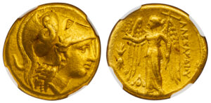ALEXANDER THE GREAT GOLD DISTATER – LIFETIME ISSUE OF AEGAE ? PUBLISHED IN WESTMORELAND COLLECTION VOLUME – VF NGC GRADED GREEK MACEDONIAN KINGDOM COIN (Inv. 20985)