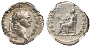 VESPASIAN SILVER DENARIUS – SEATED PAX ISSUE OF AD 75 – VF NGC GRADED ROMAN IMPERIAL COIN OF THE 12 CAESARS (Inv. 20574)