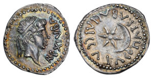 JUBA II & CLEOPATRA SELENE SILVER DENARIUS – IN NAME OF CLEOPATRA VII’S DAUGHTER WITH MARC ANTONY – CHOICE XF NGC GRADED KINGDOM OF MAURETANIA COIN (Inv. 19143)