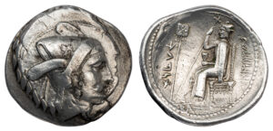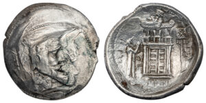 BAGADAT SILVER TETRADRACHM – CORONATION TYPE ISSUE OVERSTRUCK ON PHILIP III TETRADRACHM OF BABYLON – AU NGC GRADED KINGS OF PERSIS COIN (Inv. 20054)