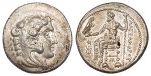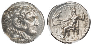 ALEXANDER THE GREAT SILVER TETRADRACHM – LIFETIME ISSUE OF MYRIANDRUS – AU NGC GRADED GREEK MACEDONIAN KINGDOM COIN (Inv. 20986)