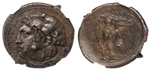 SYRACUSE BRONZE AE25 – OVERSTRIKE OF PYRRHUS ABOVE AGATHOCLES – AU NGC GRADED GREEK SICILY COIN (Inv. 20565)