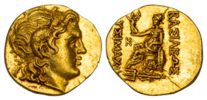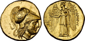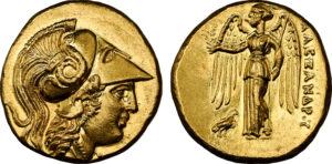 ALEXANDER THE GREAT GOLD STATER – LIFETIME ISSUE OF SARDES WITH RARE STAG HEAD SYMBOL – MINT STATE FINE STYLE NGC GRADED GREEK KINGDOM OF MACEDON COIN (Inv. 20931)