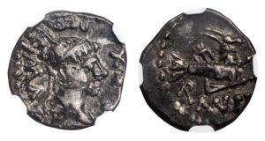 PTOLEMY OF MAURETANIA SILVER DENARIUS – CAPRICORN ISSUE OF GRANDSON OF CLEOPATRA VII – XF NGC GRADED MAURETANIAN KINGDOM COIN (Inv. 18899)