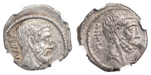 BRUTUS SILVER DENARIUS – ISSUE SHOWING BRUTUS’ FAMED ANCESTORS -CHOICE XF NGC GRADED ROMAN IMPERATORIAL COIN (Inv. 21134)