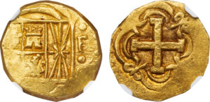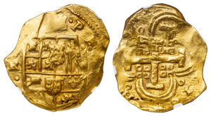 PHILIP IV GOLD 8 COB ESCUDOS -INTERESTING DIE SHIFT ERROR OF ASSAYER R ISSUE OF SEVILLE – MS 62 NGC GRADED SPAIN WORLD COIN (Inv. 20766)