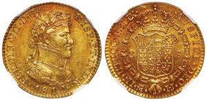 FERDINAND VII GOLD 2 ESCUDOS – “BUST” TYPE OF 1812 IB PLATED IN CALICO – MS 61 NGC GRADED SPAIN WORLD COIN (Inv. 20929)