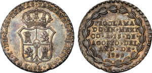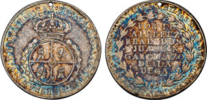 MEXICO FERDINAND VII SILVER PROCLAMATION MEDAL – 1809 QUATLA DE AMILAS ISSUE – AU SUPERB BLUE IRIDESCENCE WORLD COIN MEDAL (Inv. 20656)