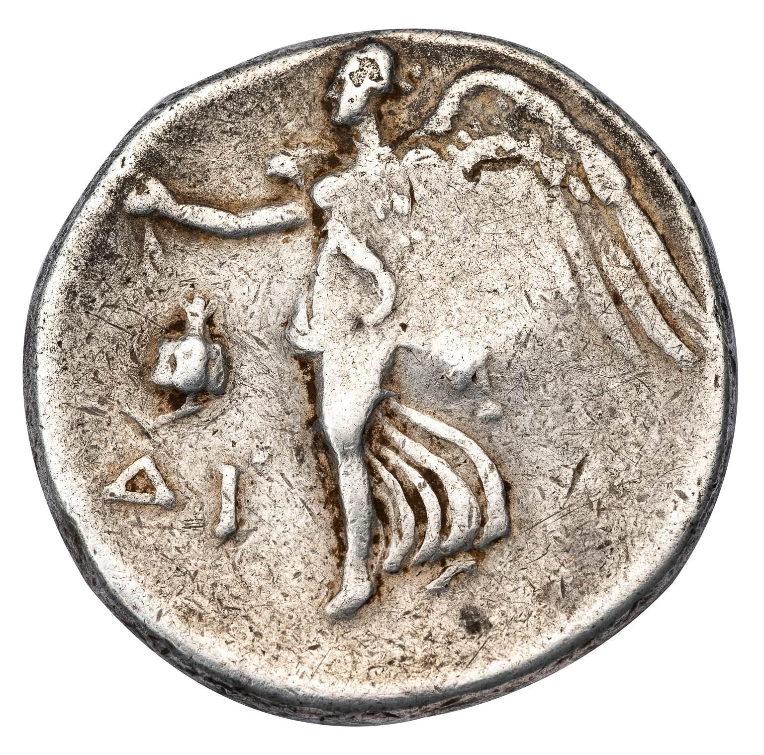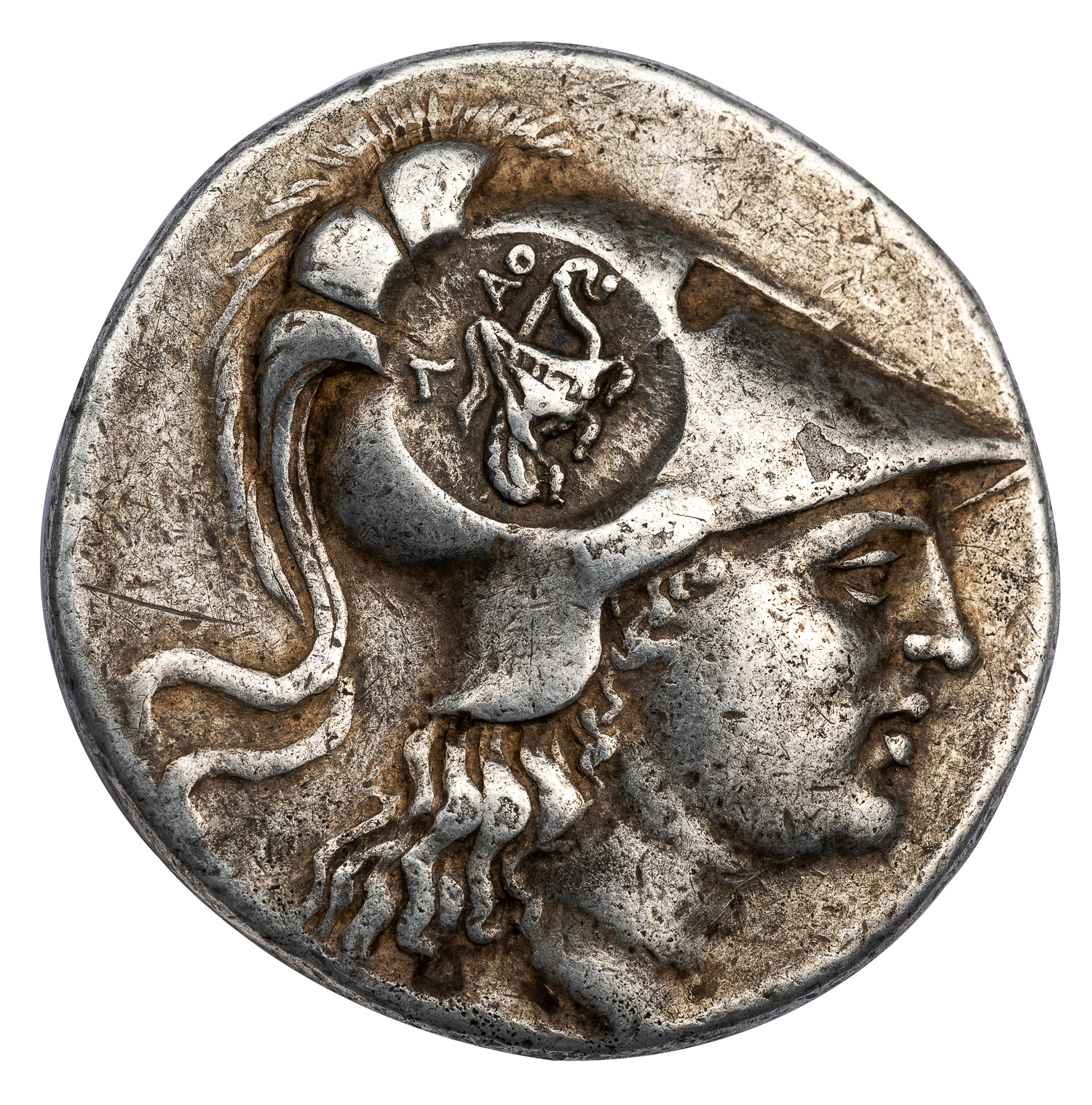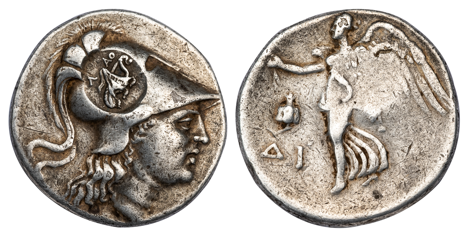 Obv. Head of Athena right, wearing Corinthian helmet, a large cistophoric countermark of Laodicea applied over the helmet. Rev. Nike moving left, offering wreath, pomegranate above ΔI in left field.
