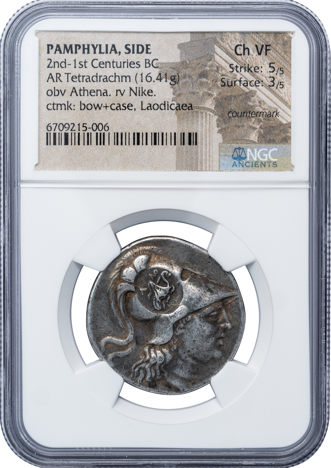 SIDE SILVER STATER – ATHENA / NIKE TYPE WITH LAODICEA COUNTERMARK – CHOICE VF NGC GRADED GREEK PAMPHYLIA COIN (Inv. 18643)