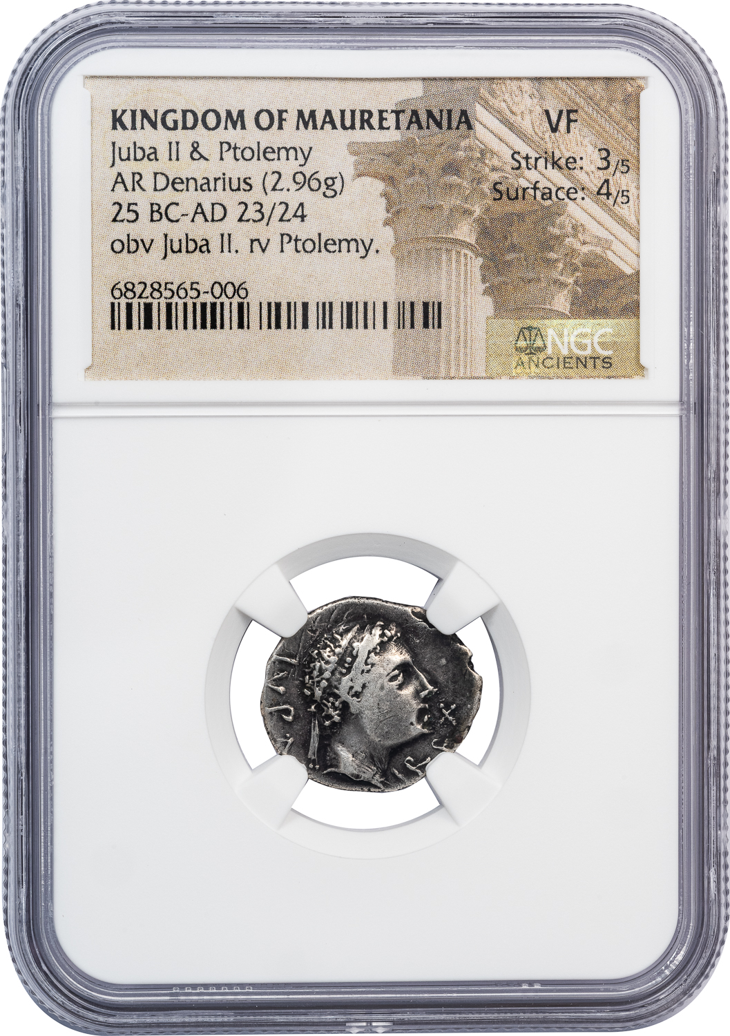 JUBA II & PTOLEMY SILVER DENARIUS – RARE ISSUE WITH FATHER AND SON PORTRAITS – VF NGC GRADED KINGDOM OF MAURETANIA COIN (Inv. 19144)