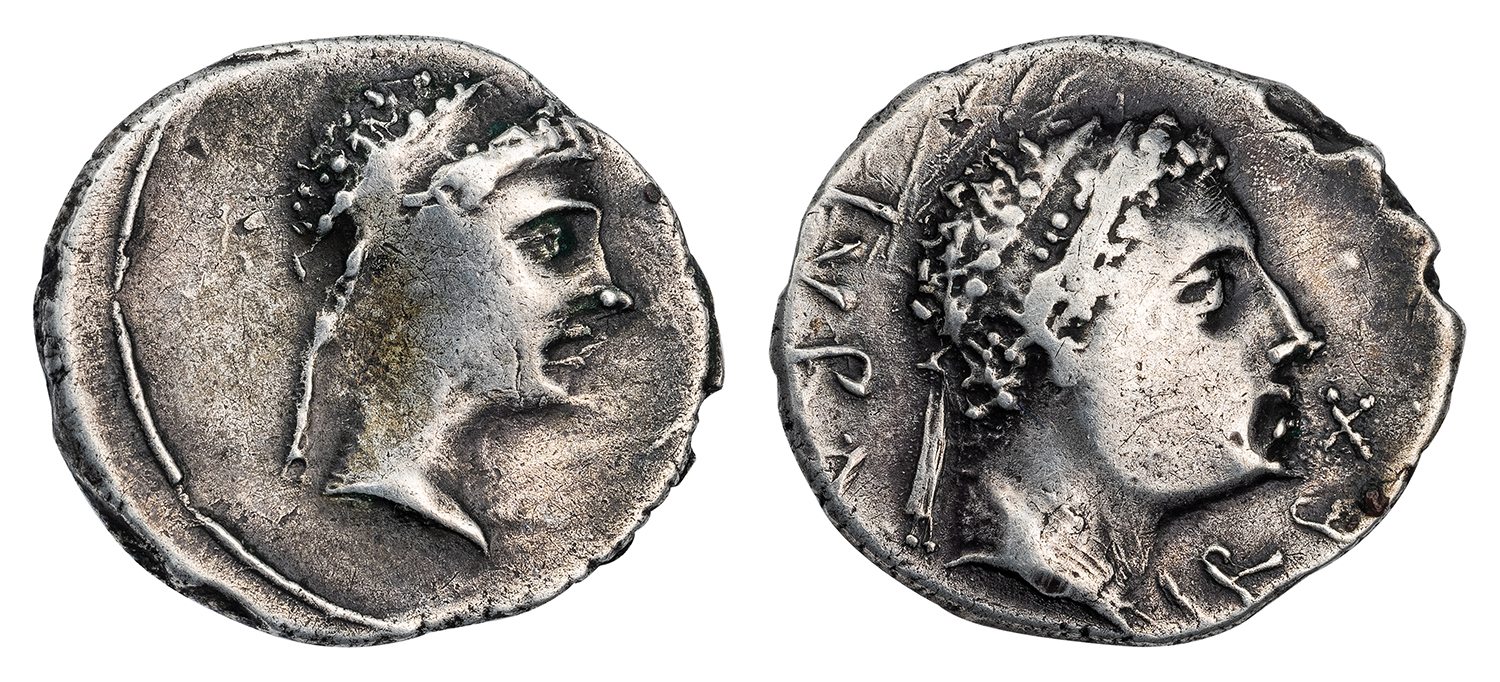 Obv. IVBA REX, diademed and draped bust of Juba right. Rev. Diademed head of Ptolemy right.