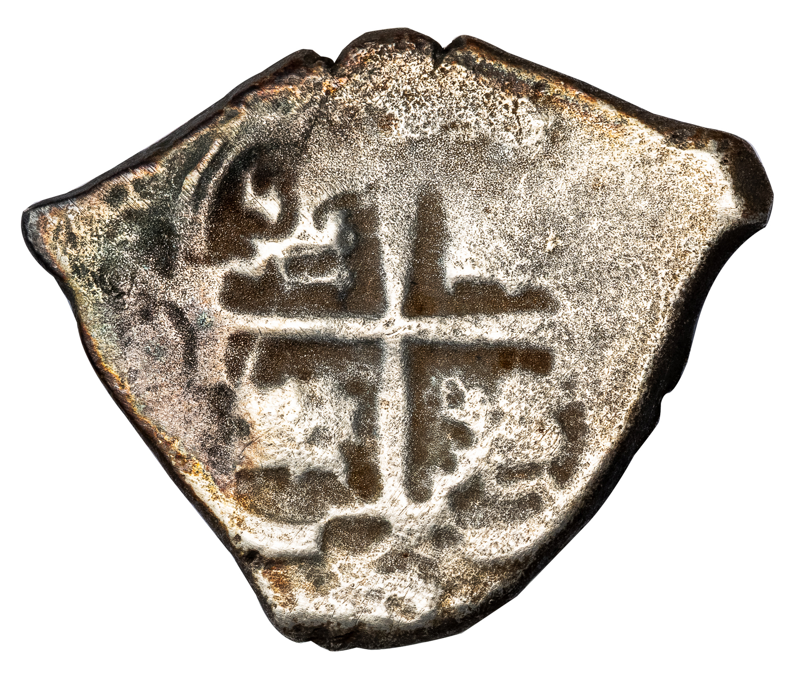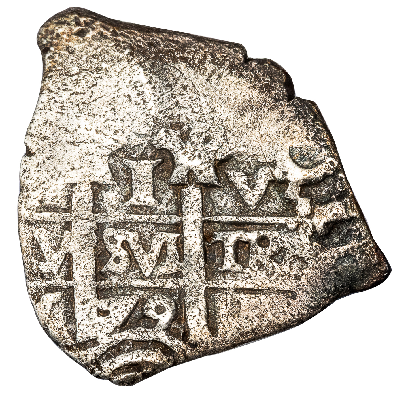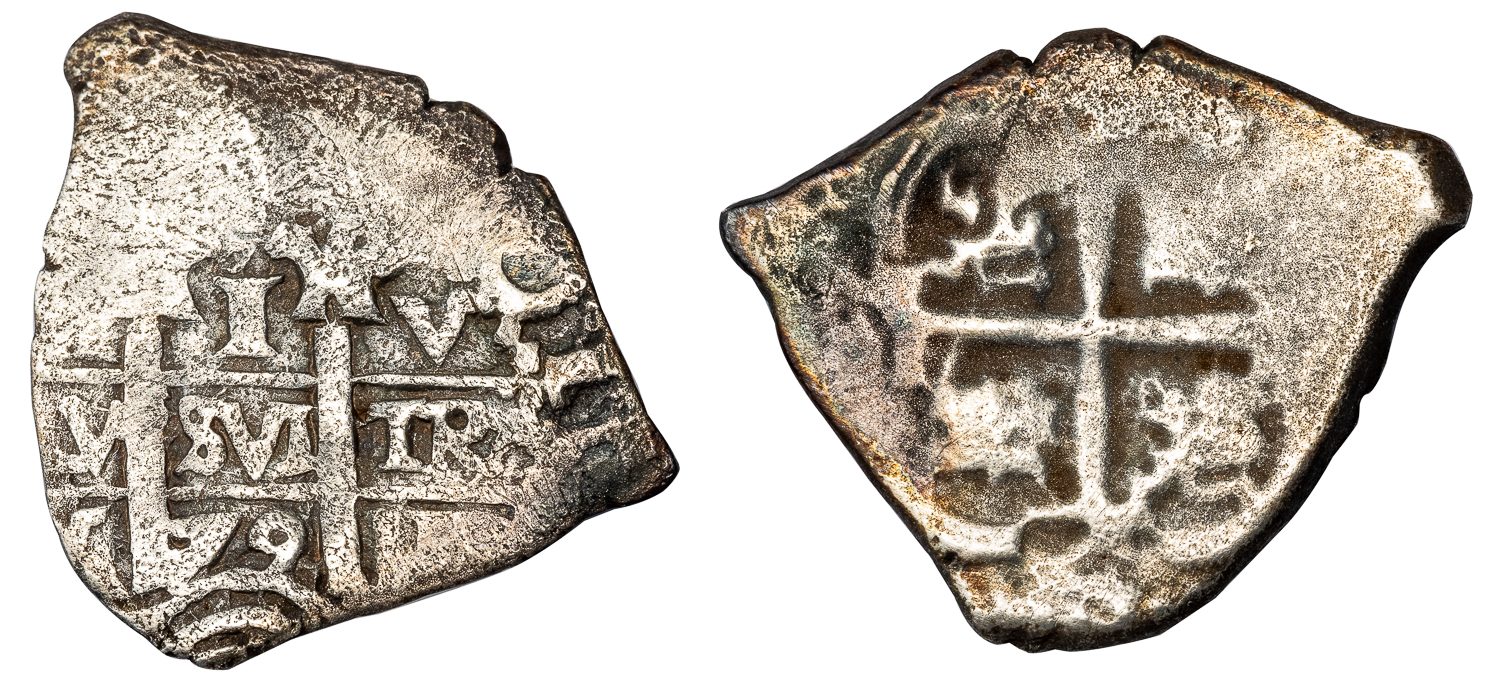 Salvaged from the “Consolación” (sunk in 1681 off Santa Clara “Isla de los Muertos,” Ecuador). Partial date 79 and assayer mark V visible on obverse.
