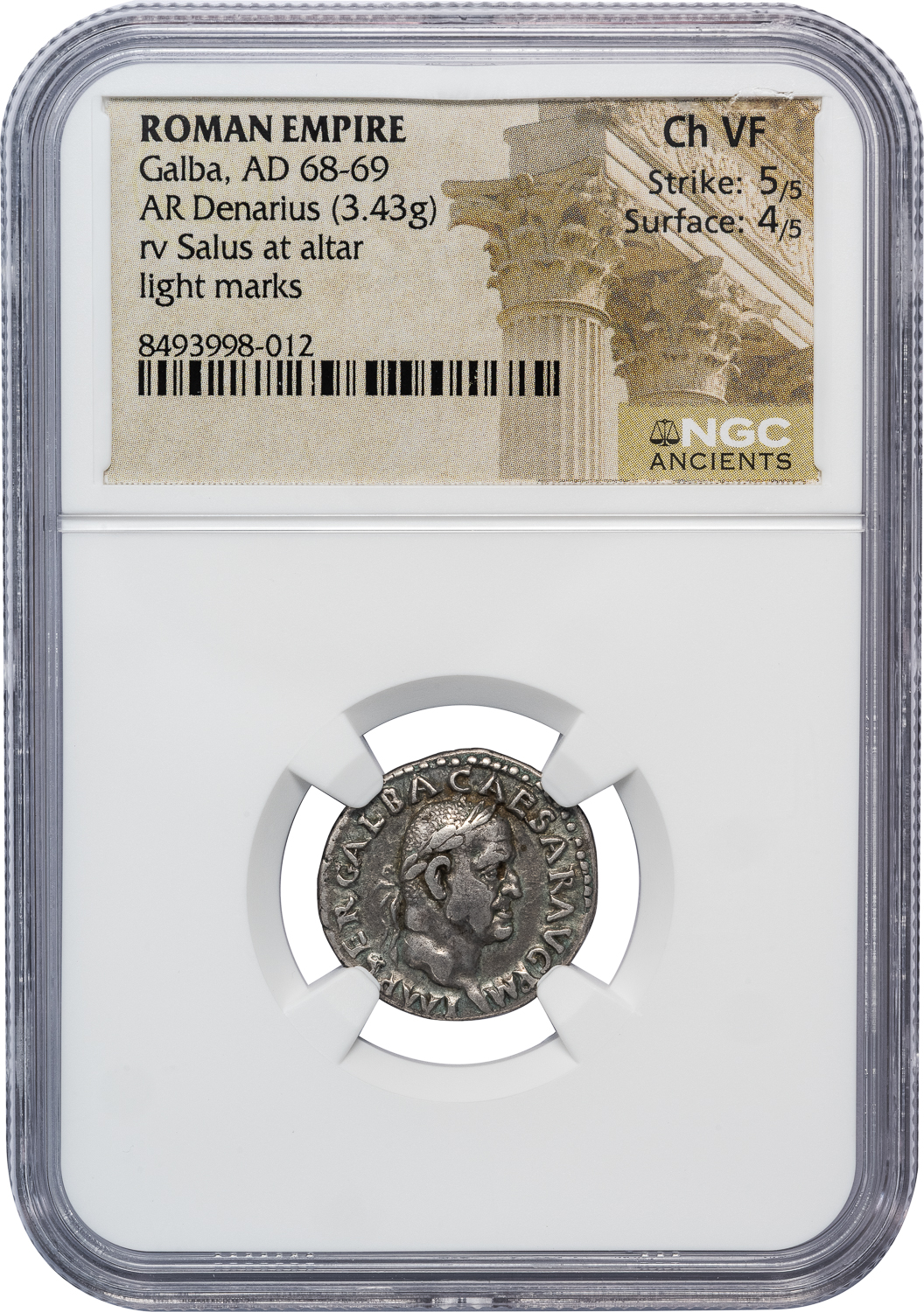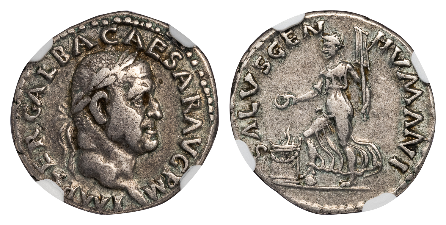 GALBA SILVER DENARIUS – SALUS ISSUE – CHOICE VF NGC GRADED ROMAN IMPERIAL COIN OF THE 12 CAESARS (Inv. 20999)