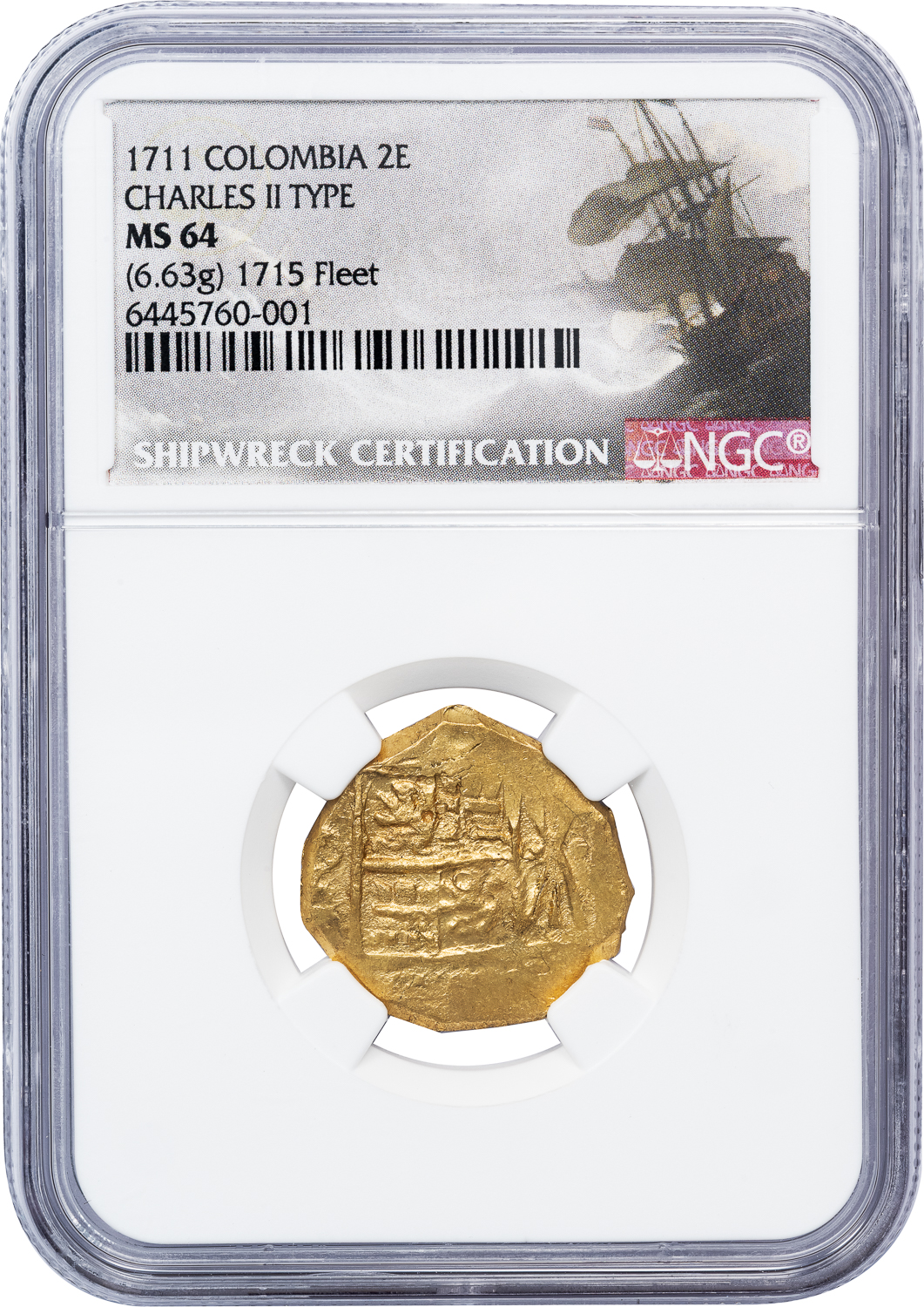 NGC graded MS64, Shipwreck Certification, “1715 Fleet” NGC label.