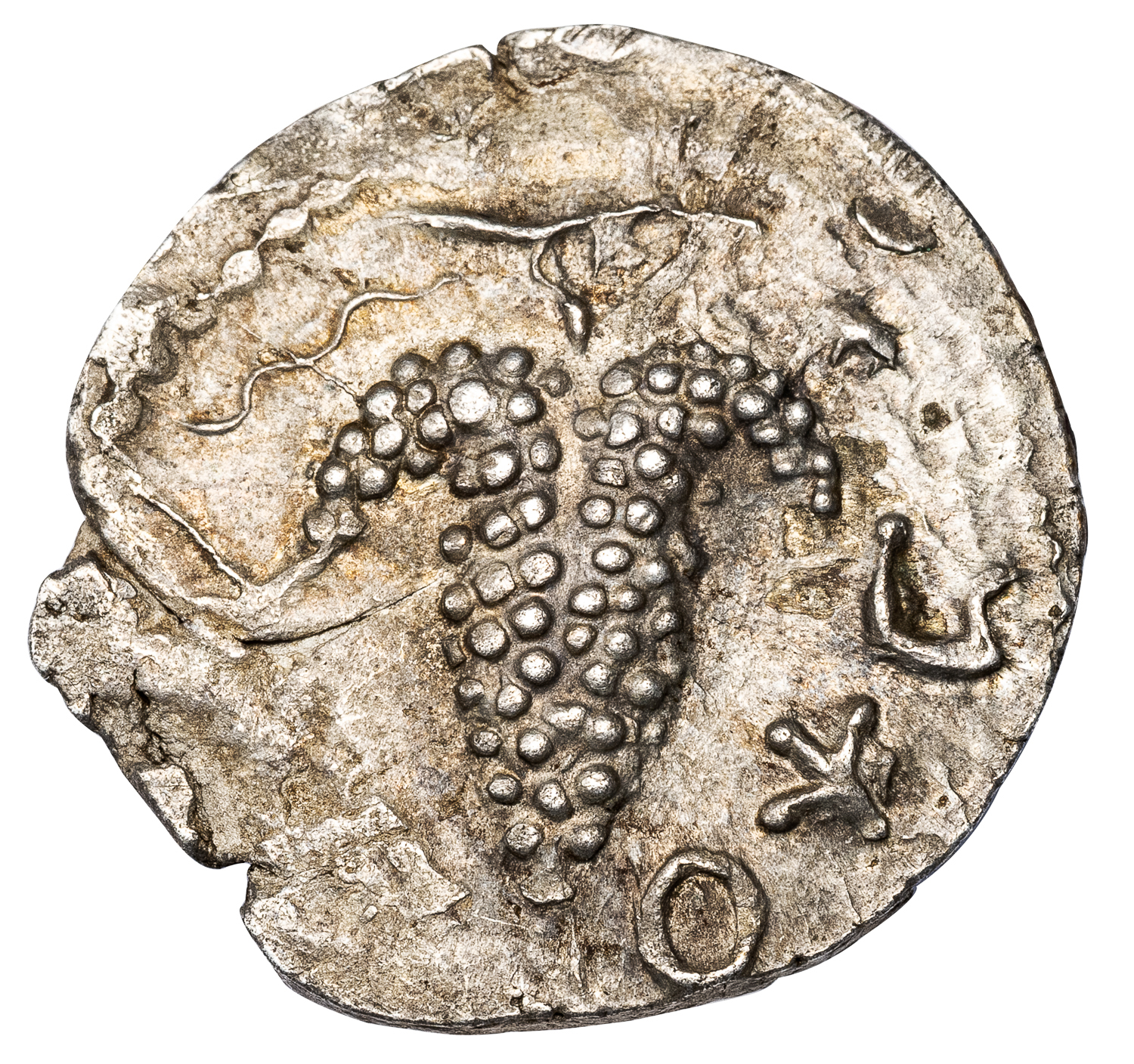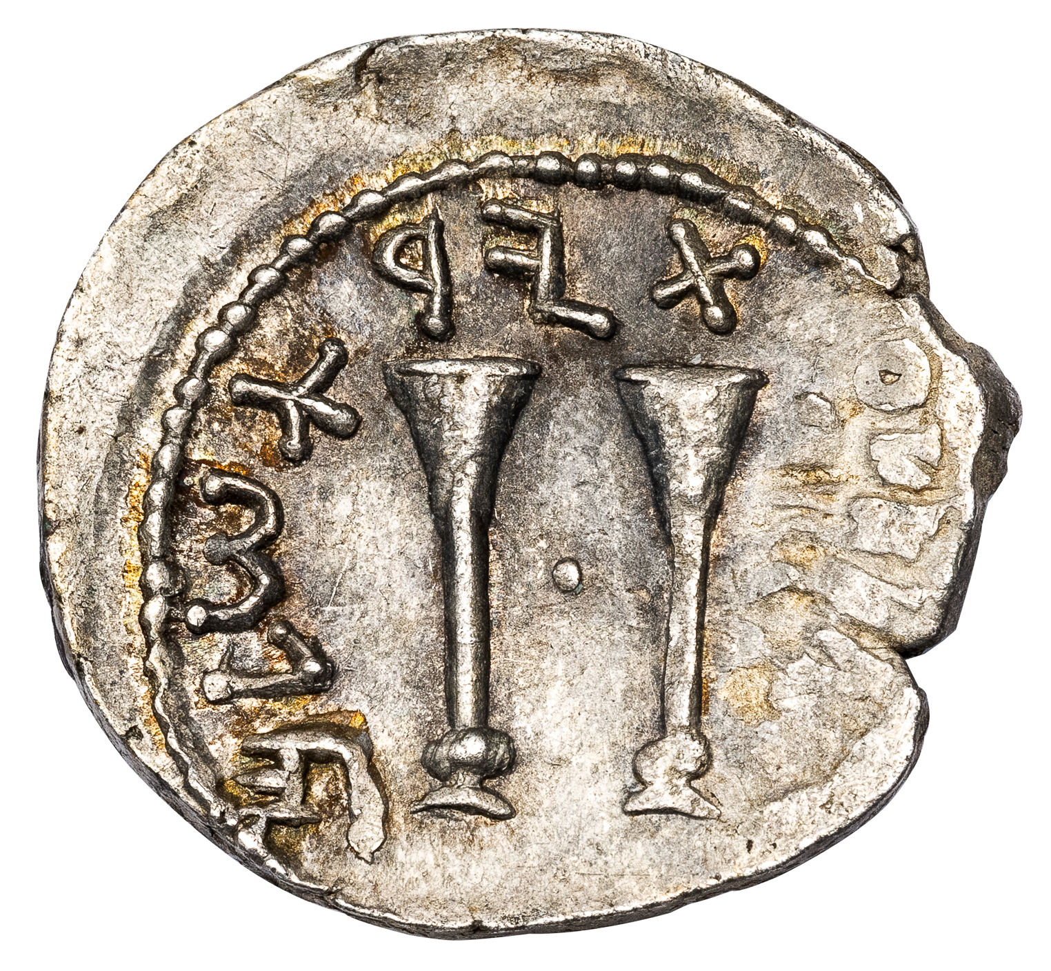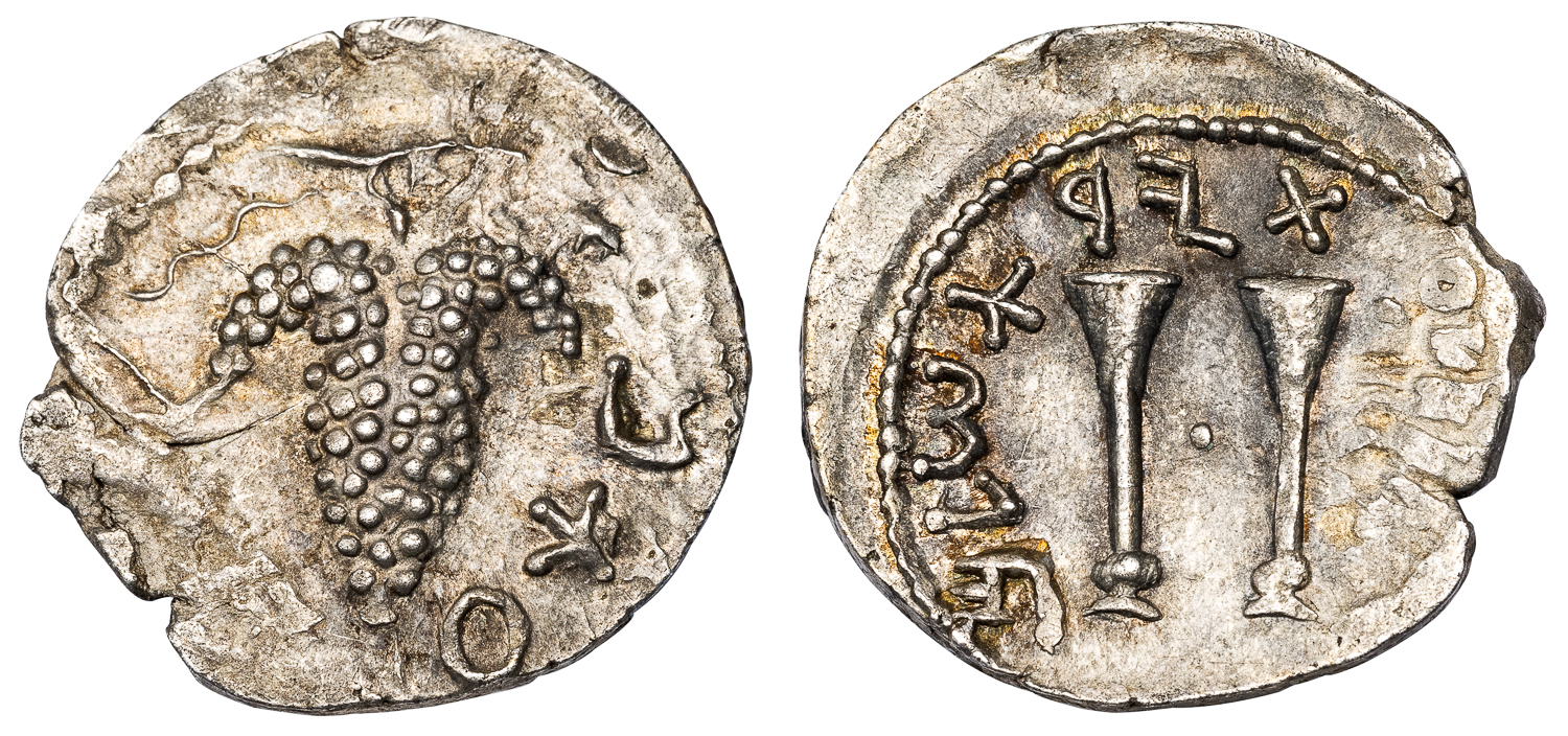 Obv. [SIMON] grape bunch hanging from vine. Rev. [FOR THE FREEDOM OF JERUSALEM], two trumpets.