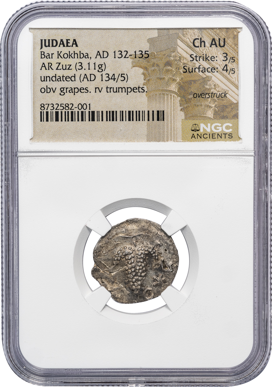 BAR KOKHBA REVOLT SILVER ZUZ – UNDATED YEAR 3 ISSUE MILDENBERG 167 – CHOICE AU NGC GRADED JEWISH JUDAEA COIN (Inv. 21030)