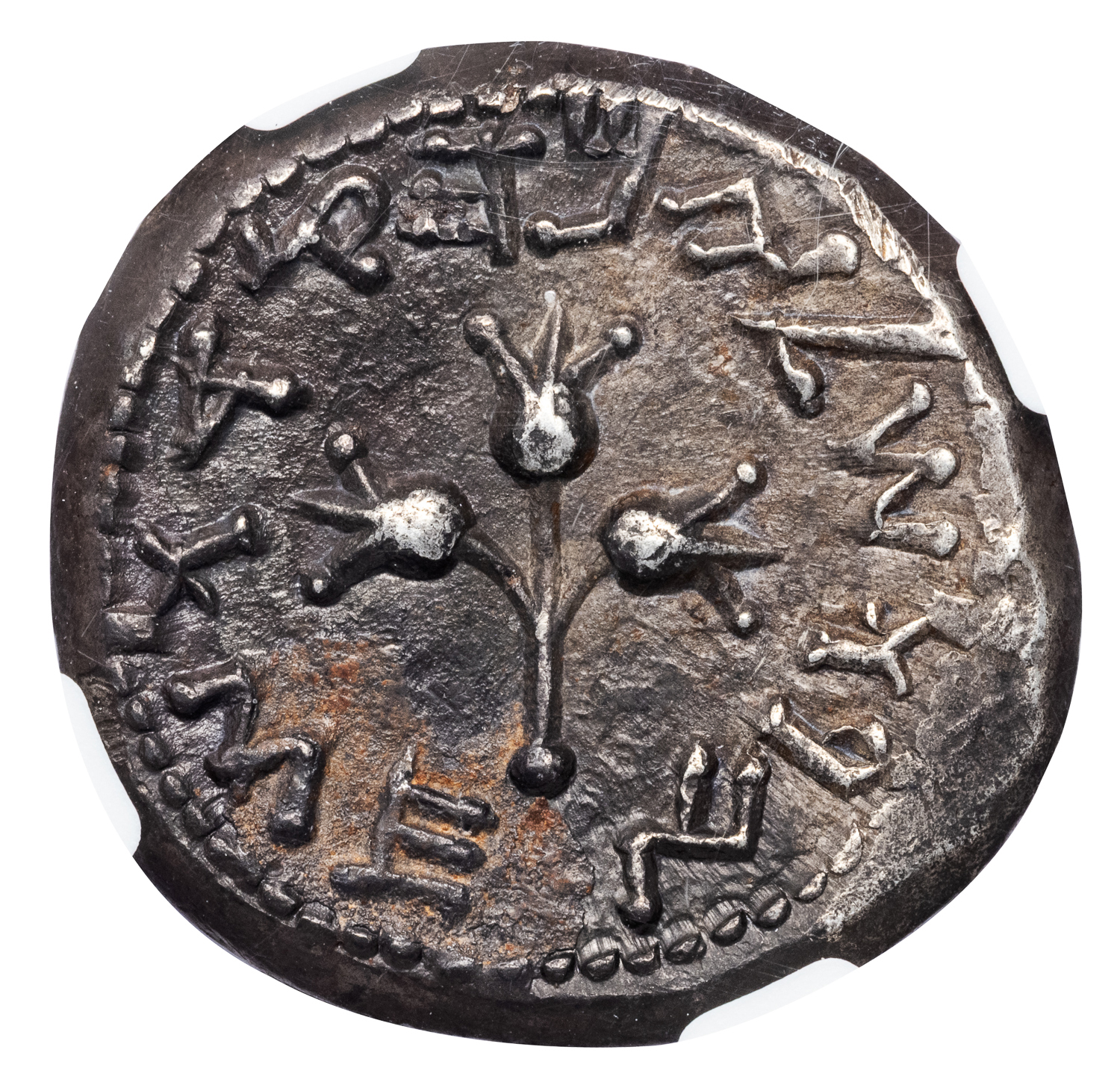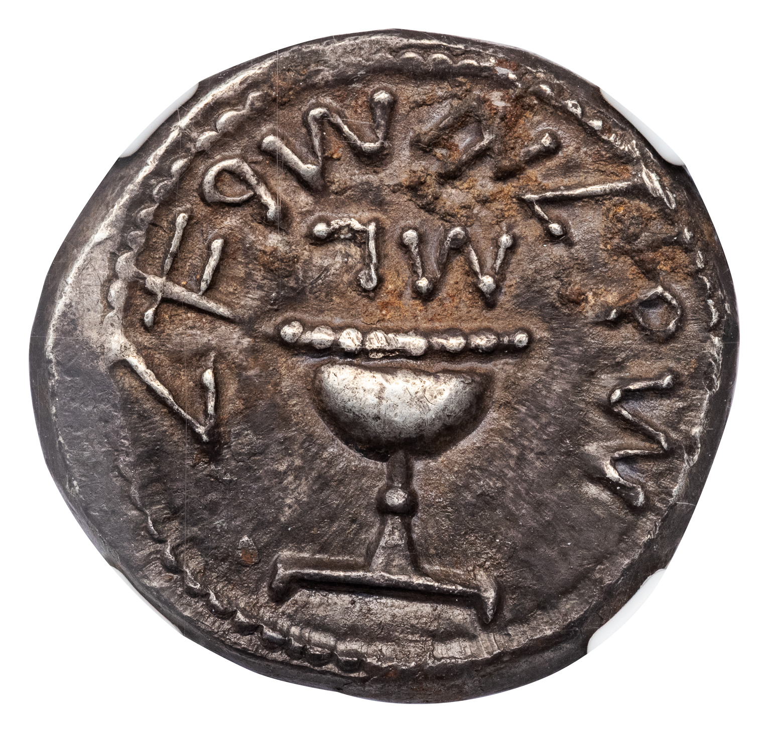 Obv. “Shekel of Israel; year 3” (paleo–Hebrew), chalice with rim of eight pearls. Rev. “Jerusalem the Holy” (paleo–Hebrew), staff with three pomegranate buds.