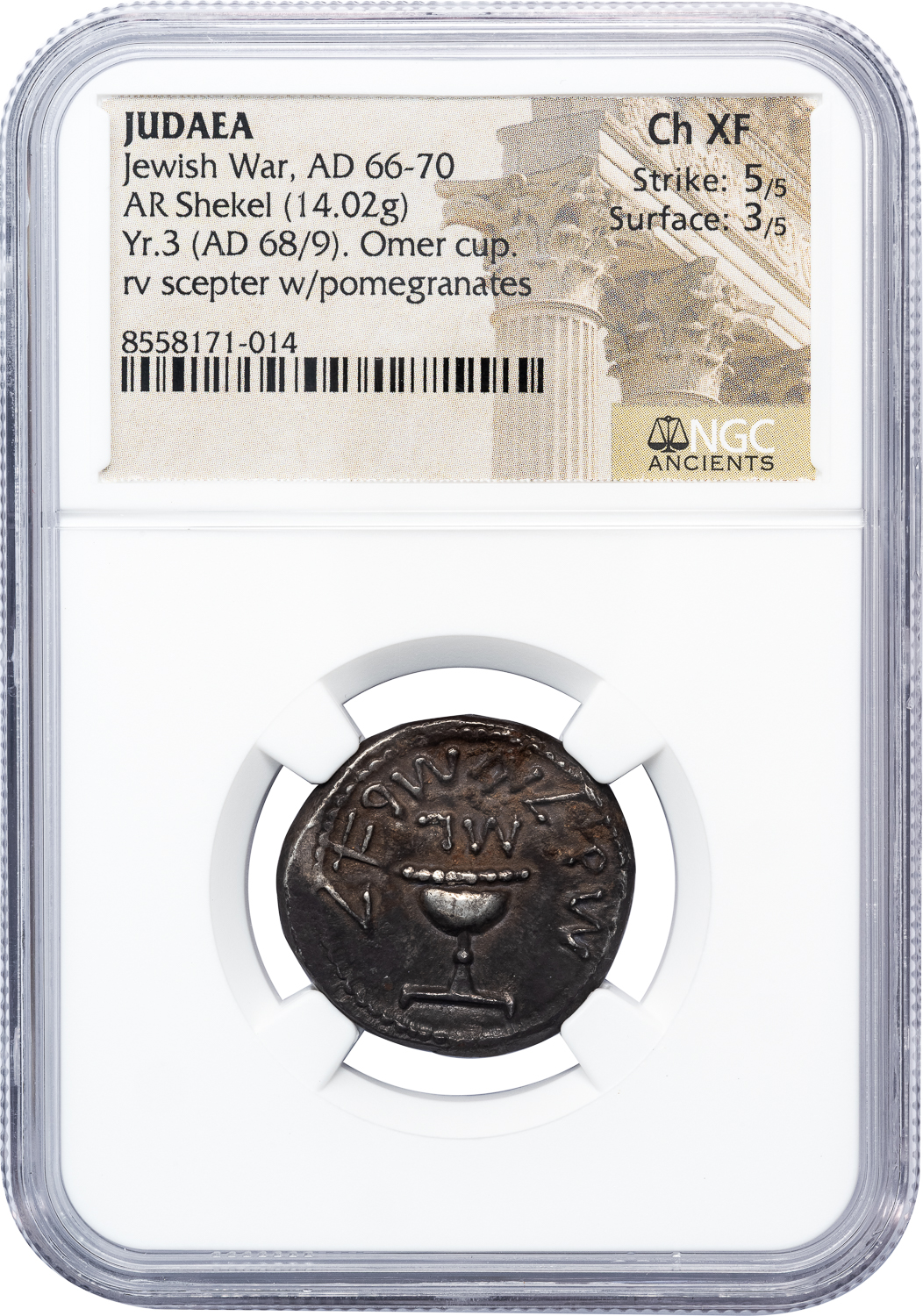 JUDAEA SILVER SHEKEL FROM JEWISH WAR – YEAR 3 ISSUE EX SAMEL COLLECTION – CHOICE XF NGC GRADED JEWISH COIN (Inv. 21052)