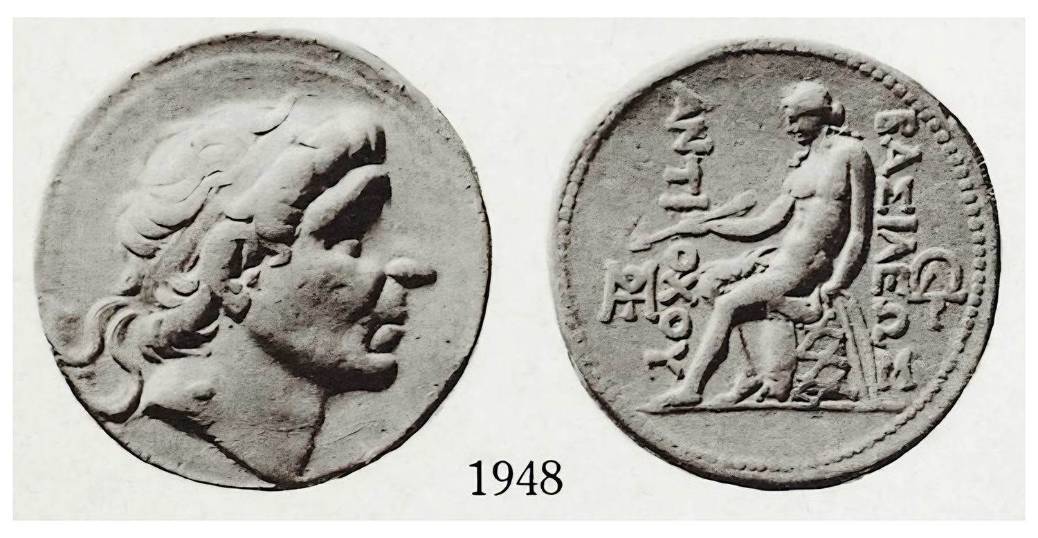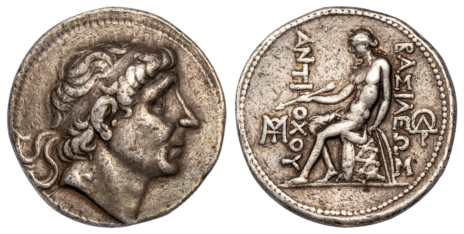 Obv. Diademed head of Antiochus I right. Rev. ΒΑΣΙΛΕΩΣ ANTIOXOY, Apollo seated left on omphalos, holding arrow in right hand and resting left hand on grounded bow, MTEYO control in outer left field, ΩΔP control in outer right field.