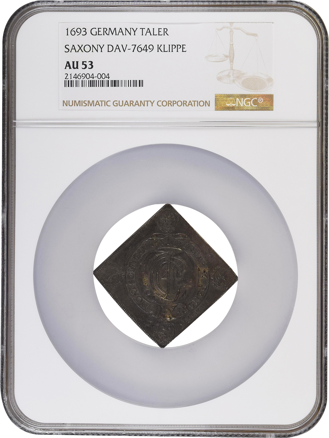 SAXONY JOHANN GEORG SILVER TALER KLIPPE – 1693 ISSUE – AU 53 NGC GRADED WORLD GERMANY COIN (Inv. 21080)