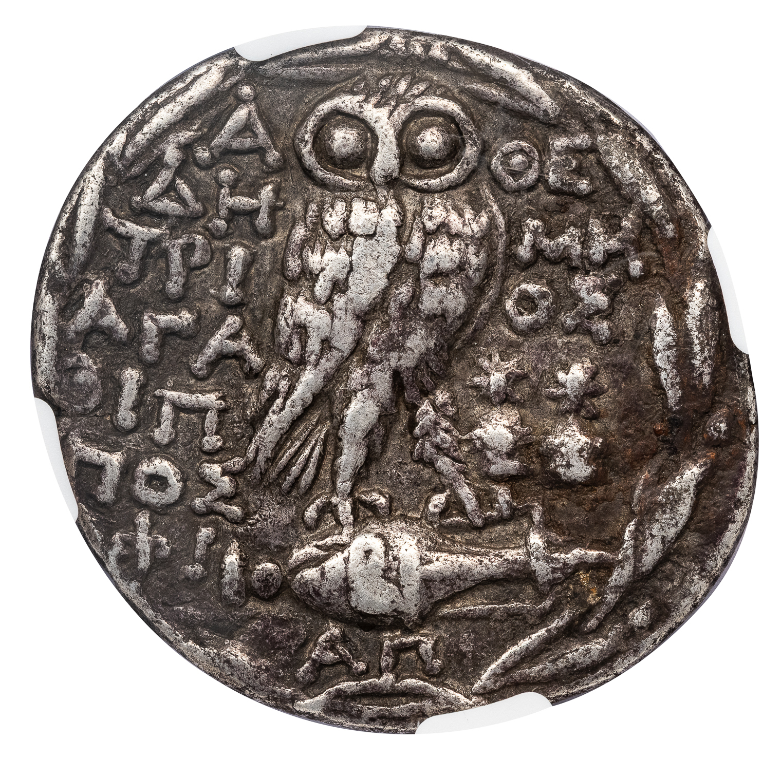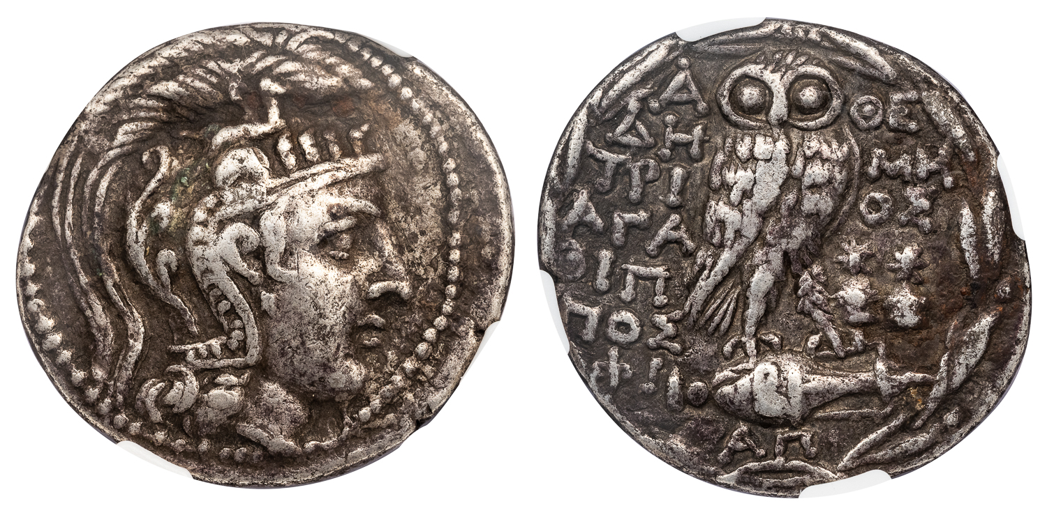 Obv. Helmeted head of Athena right. Rev. AΘE, owl standing right, head facing, magistrates’ names (ΔHMHTPIOΣ / AΓAΘIΠΠOΣ / ΦI) in fields, caps of the Dioscuri in right field, B (month) on amphora, AΠ in exergue, all within wreath.