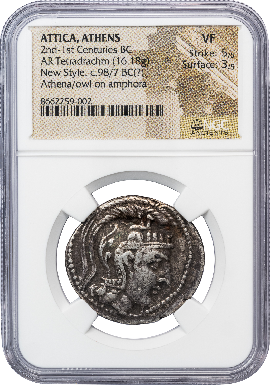 ATHENS NEW STYLE SILVER TETRADRACHM – VERY RARE VARIETY OF YEAR 98/7 BC – VF NGC GRADED GREEK ATTICA COIN (Inv. 21089)