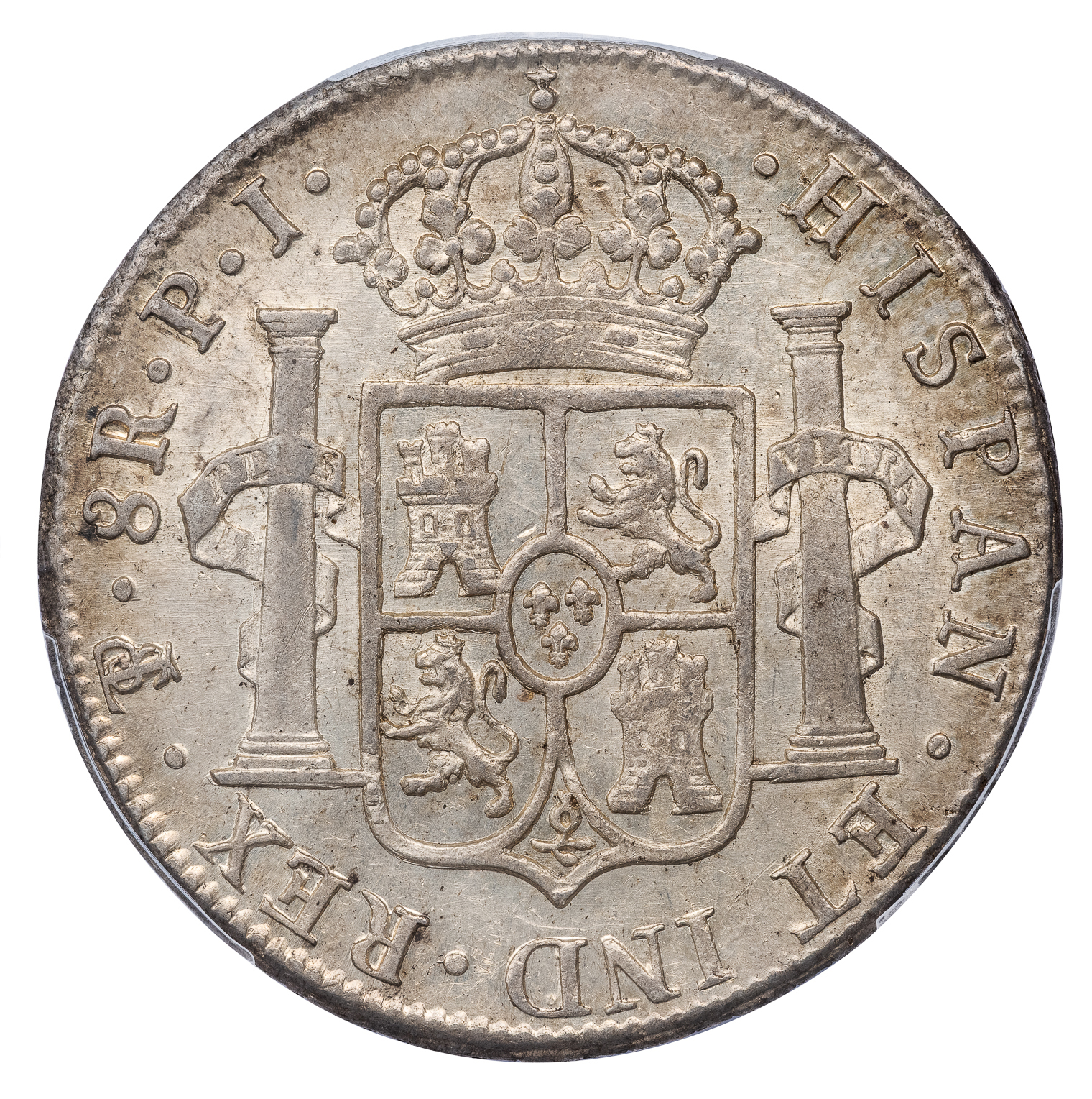 Silver 8 Reales, 1819–PTS PJ, 38 mm. Potosi Mint.