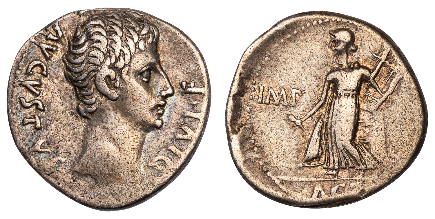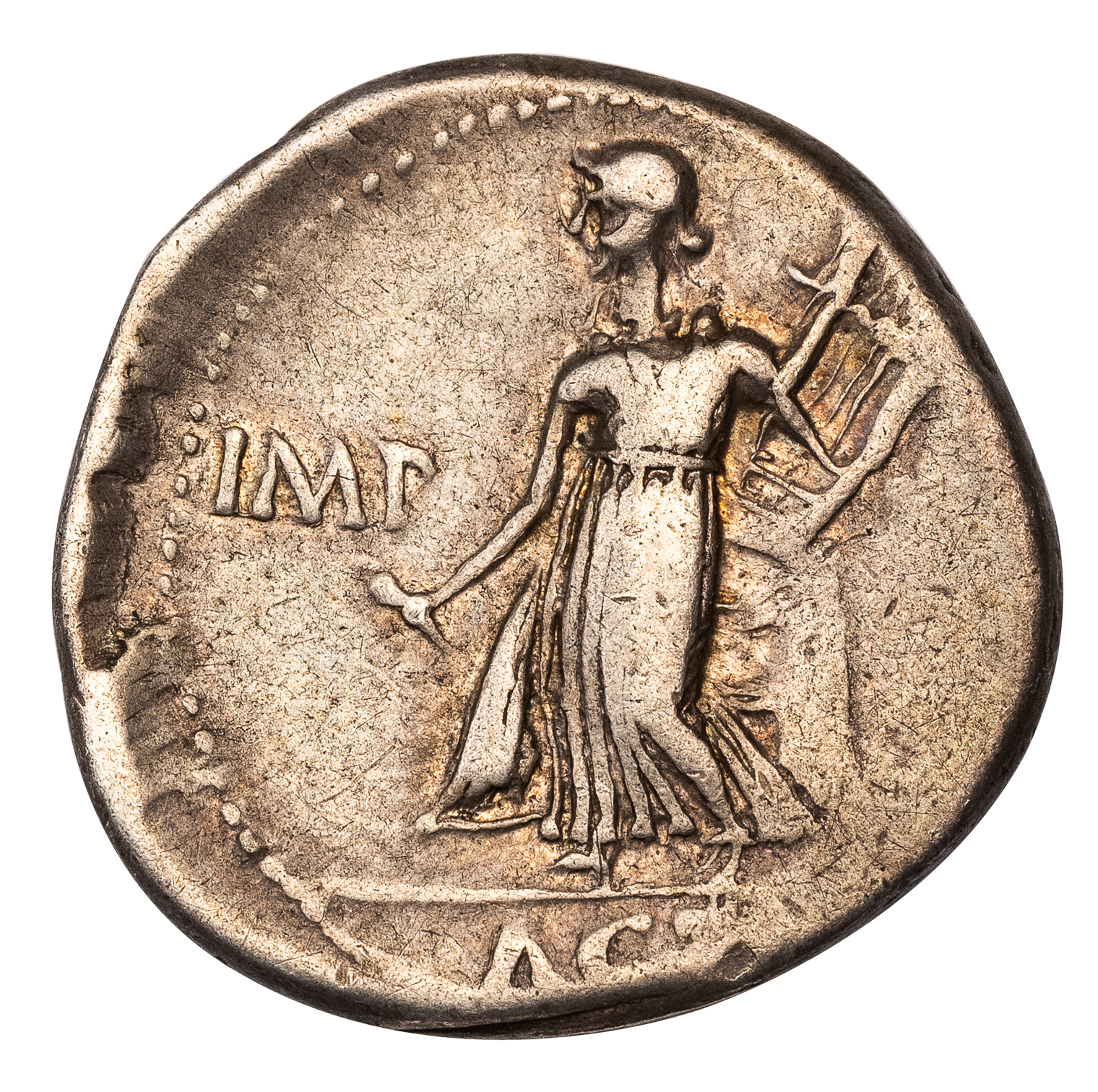 The coin type references the role of Apollo at the Battle of Actium, where the god was believed to have manifested himself, securing victory for Octavian’s forces against the joint fleets of Antony and Cleopatra. Actium was the decisive encounter that secured complete power for Octavian and Apollo’s role was often referenced in Augustan propaganda. Virgil mentions the prominent role of Apollo in book 8 of the Aeneid: “Overlooking it all, Actian Apollo / Began to pull his bow. Wild at this sight / All Egypt, Indians, Arabians, all / Sabaeans put about in flight, and she, / The queen (Cleopatra), appeared crying for winds to shift…But Caesar then in triple triumph rode / Within the walls of Rome, making immortal / Offerings to the gods of Italy…” Aeneid, 8.704 ff (R. Fitzgerald translation, 1981).