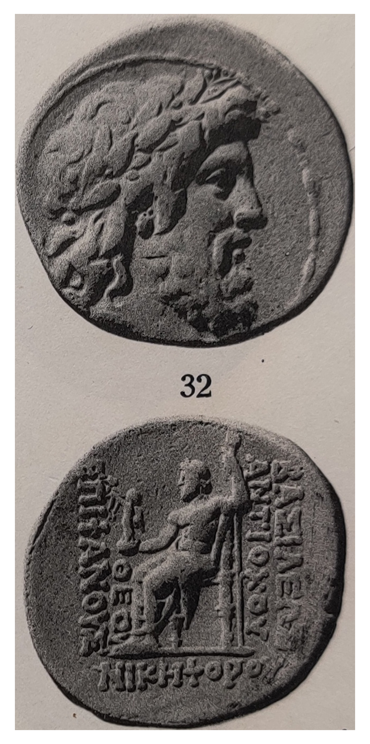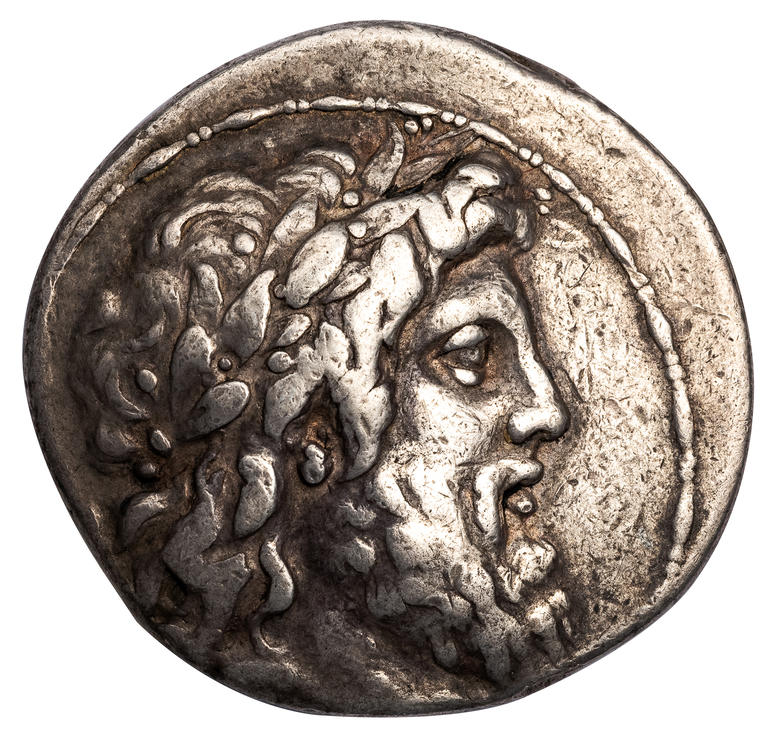 Antiochus IV Epiphanes (“the God Manifest”) was the infamous Seleucid king responsible for desecrating the Jewish Temple in Jerusalem in 168 BC and repurposing the sacred space as a sanctuary dedicated to Zeus, his favorite deity. In the same year, a special series of tetradrachms featuring Zeus on both the obverse and reverse was struck in connection with a great parade held in the Antiochene suburb of Daphne to showcase the king’s military power. This special Zeus series continued in production until 164 BC. The present tetradrachm belongs to the late period of production but still serves the apparent purpose of identifying the king with the god and perhaps even implying that he saw himself as an incarnation of Zeus in his kingdom. Indeed, it has been suggested sometimes that the features of Antiochus VI might be detectable behind the beard of Zeus on some dies of the early issues. It is somewhat ironic that a king who seems to have thought of himself as a Zeus on earth died of a wasting disease while on campaign in Persis in 164 BC. His death was thought by many to have been a divine punishment for his acts in life. Jews attributed his death to divine vengeance for his desecration of the Temple, while Persians and other non–Jews believed he was struck down for attempting to plunder the temple of Artemis–Nanaia in Persis.