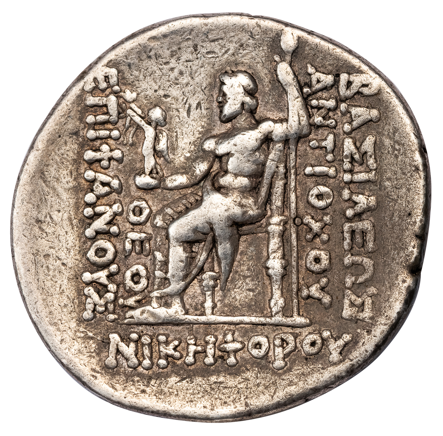 Obv. Laureate head of Zeus right. Rev. BAΣIΛEΩΣ ANTIOXOY / ΘEOY EΠIΦANOYΣ / NIKHΦOPOY, Zeus seated left on throne, holding Nike in his right hand and scepter in his left.