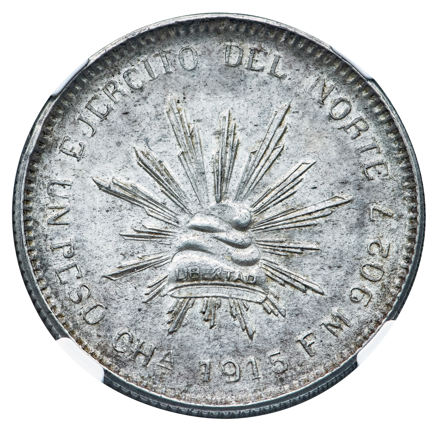 Silver Peso, 1915 CH FM, 38 mm. Chihuahua mint, assayer “FM”.