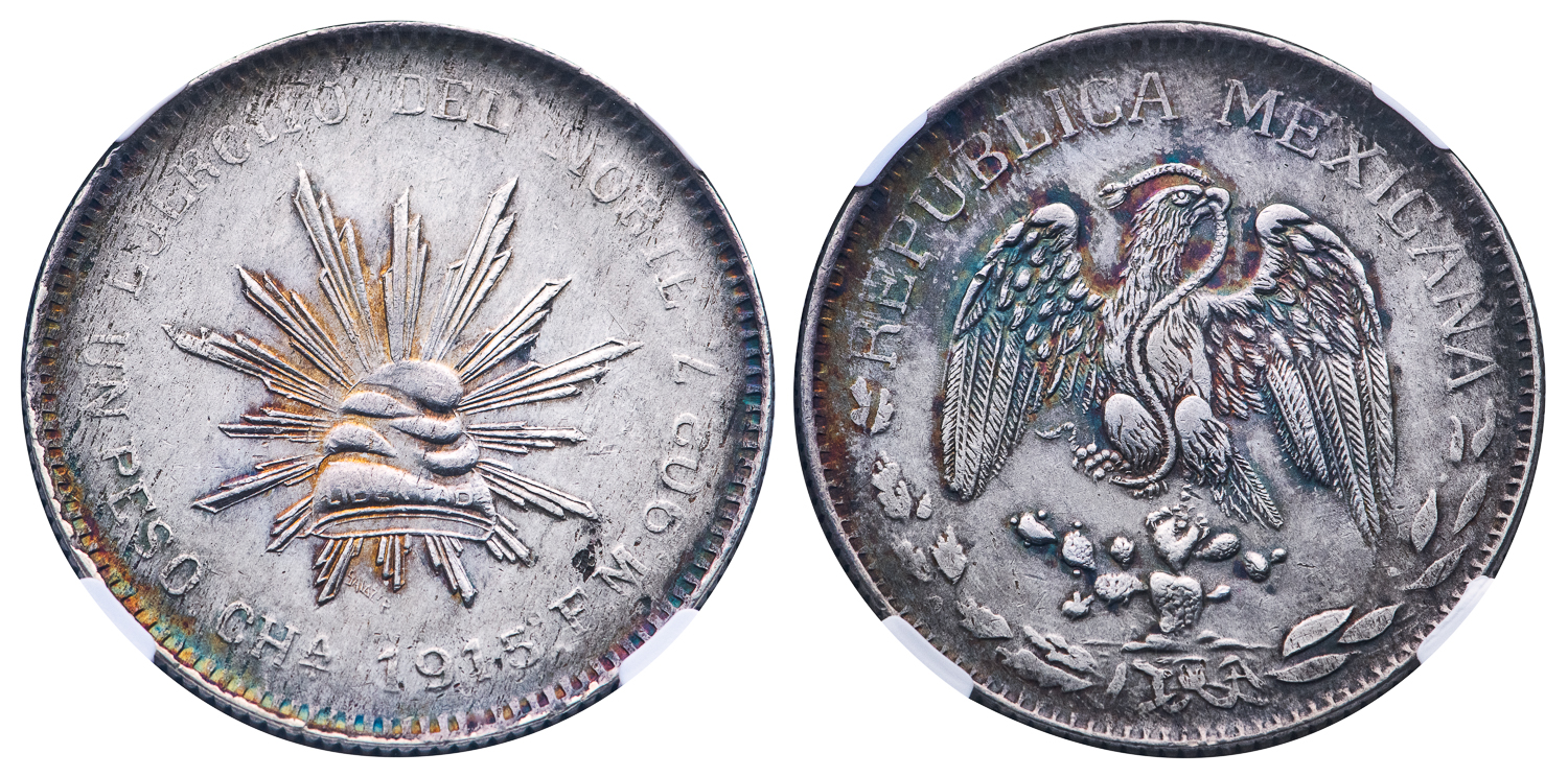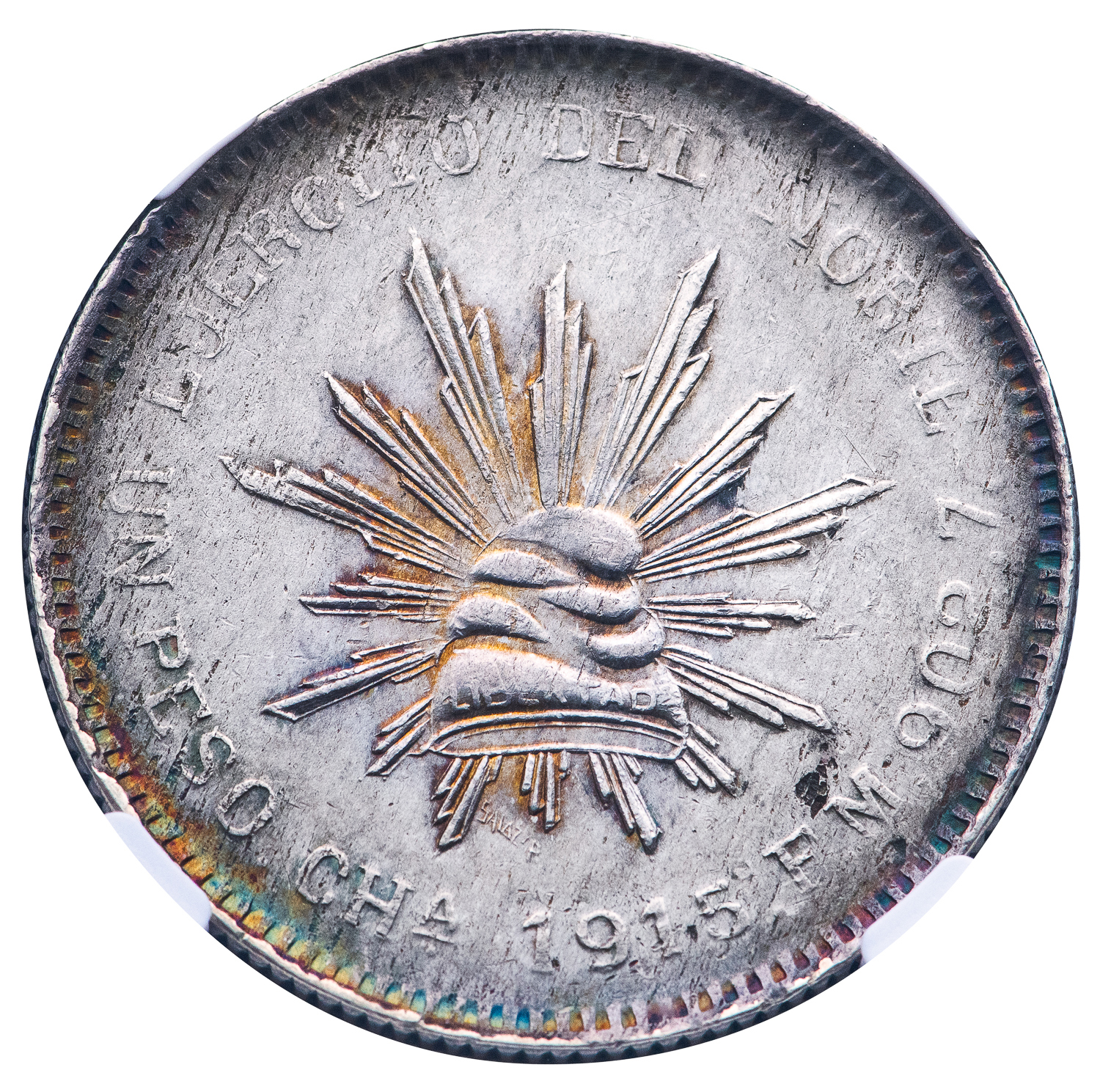 MEXICO REVOLUTIONARY “ARMY OF THE NORTH” ISSUE – 1915 CH FM – MS61 RAINBOW TONED NGC GRADED WORLD COIN (Inv. 21160)