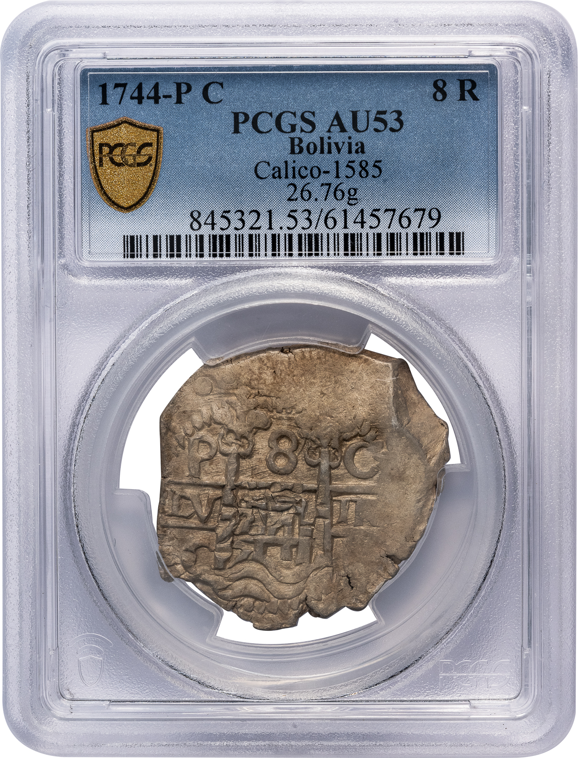 BOLIVIA SILVER COB 8 REALES – 1744-P C ISSUE – AU 53 PCGS GRADED WORLD COIN (Inv. 21163)