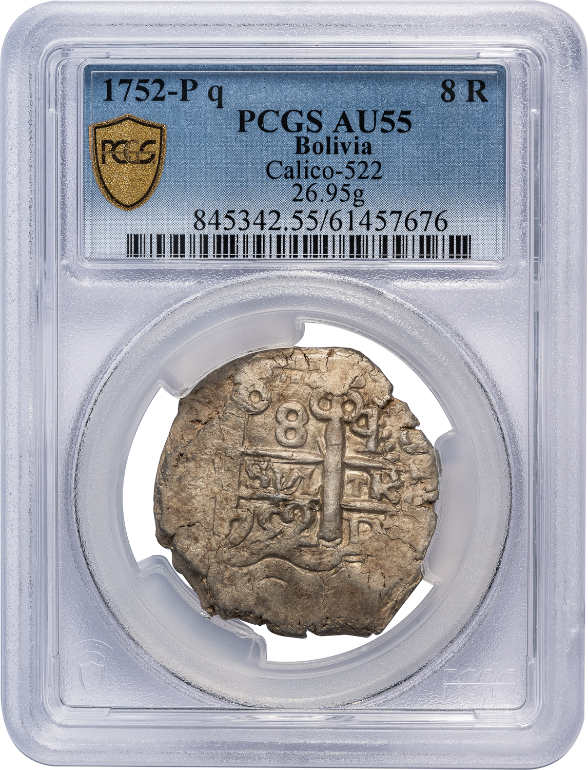 BOLIVIA SILVER COB 8 REALES – 1752-P p ISSUE – AU 55 PCGS GRADED WORLD COIN (Inv. 21164)