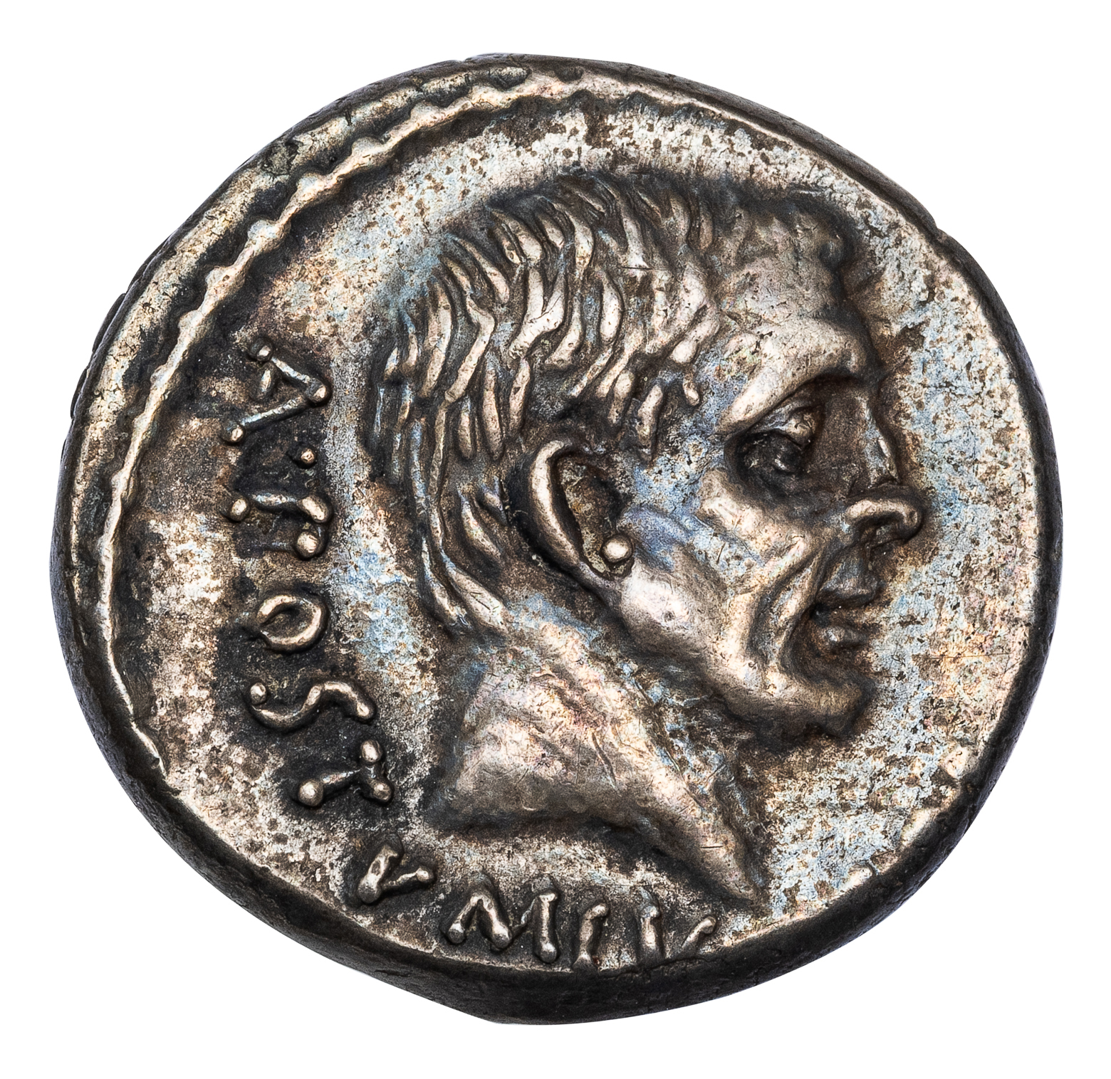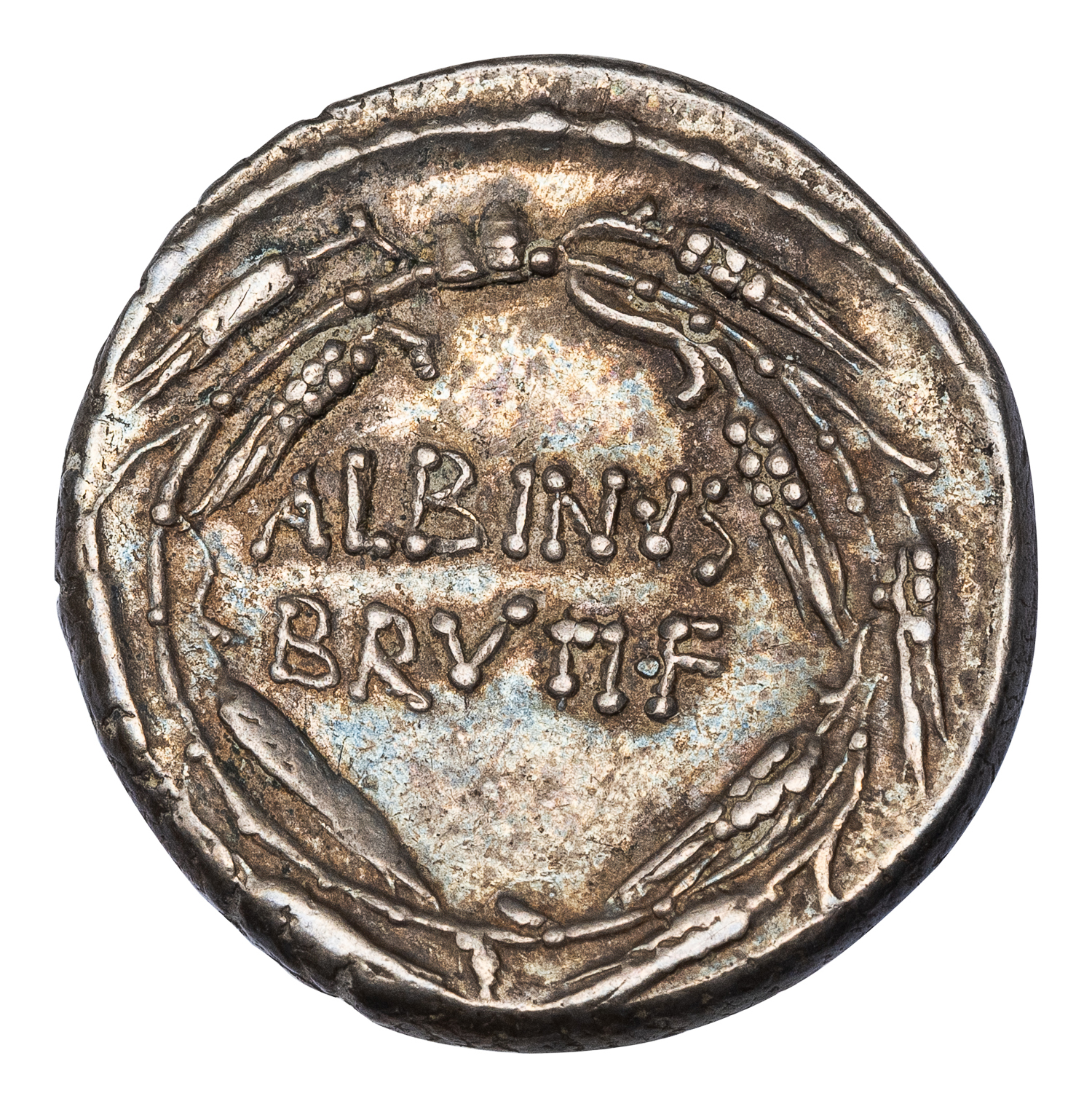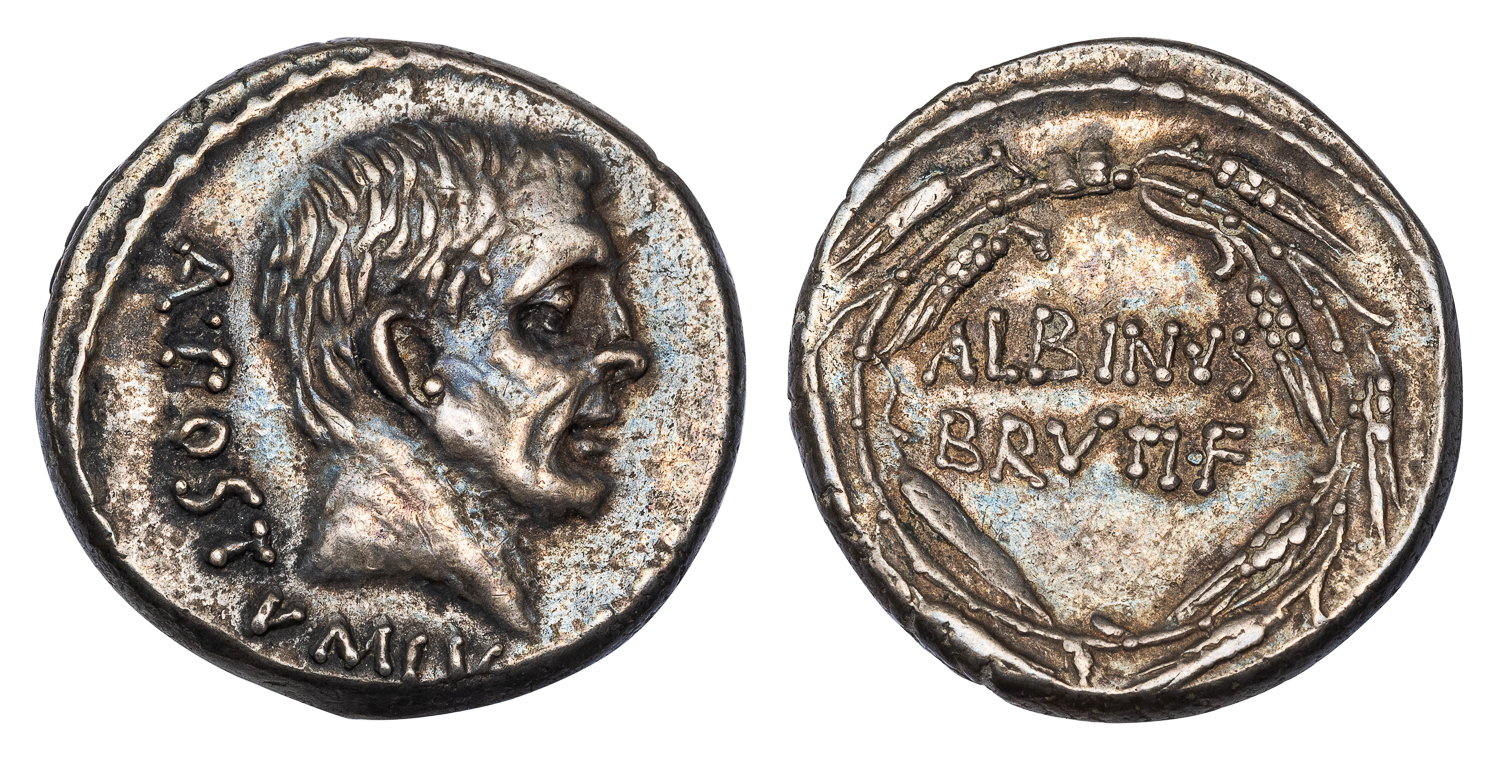 Obv. A POSTVMIVS [COS], bare head of consul Aulus Postumius Albinus right. Rev. ALBINVS/BRVTIF in two lines within wreath of grain.
