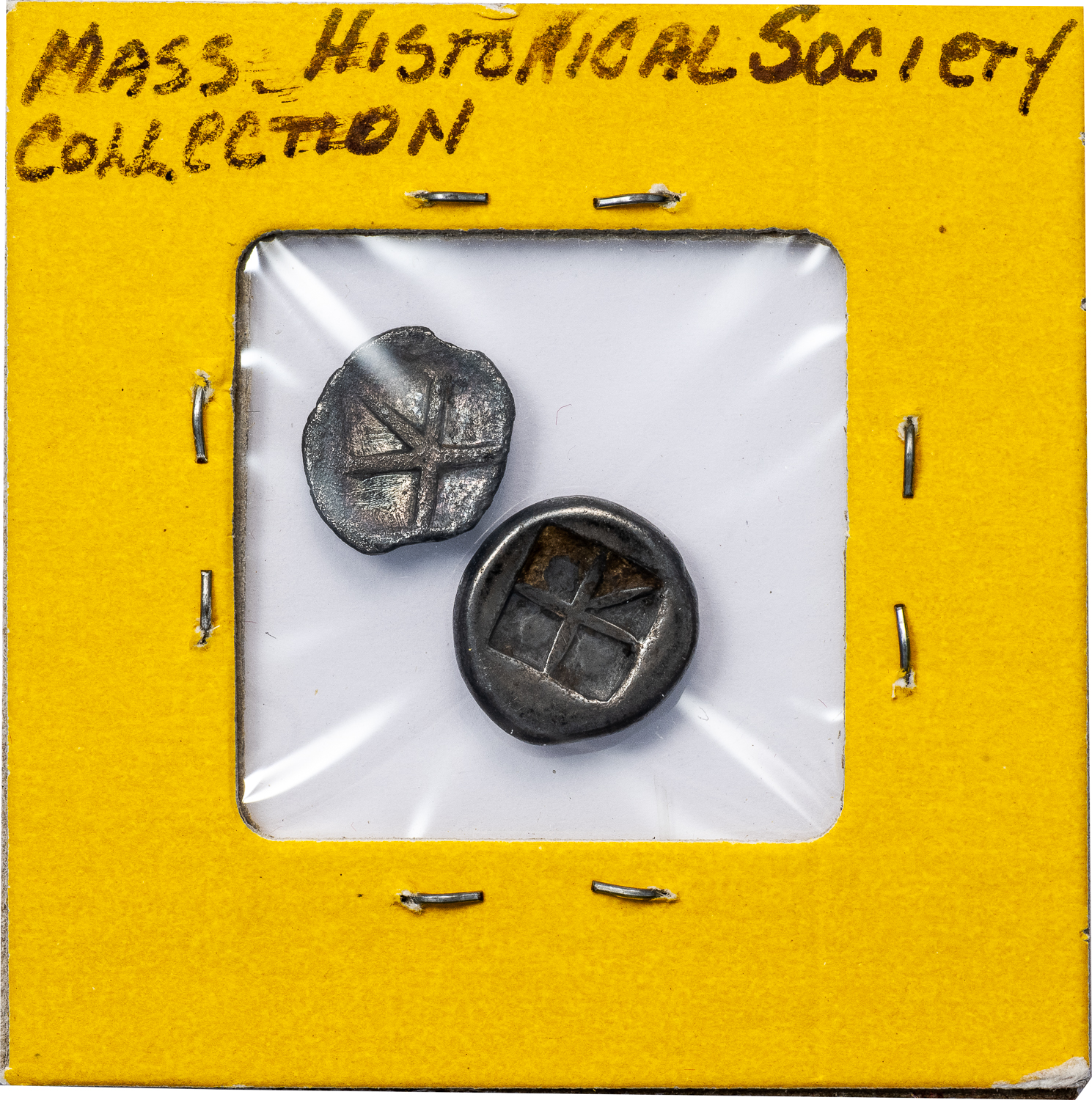 20821. Lot of 2 Aegina silver fractions, sold as a pair in Stack’s, The Massachusetts Historical Society Sale, Part 1, March 5-6, 1971, lot. 217, in yellow 2×2 holder labeled “Mass. Historical Society Collection”: