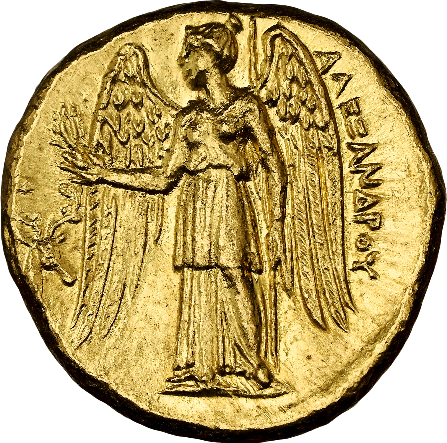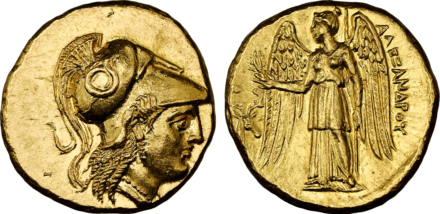 Obv. Head of Athena right, wearing large Corinthian helmet with coiled snake ornament below the plume. Rev. ΑΛΕΞΑΝΔΡΟΥ, Nike standing, her hair gathered in a topknot, looking left, holding wreath in right hand and stylis over left shoulder, large stag head looking right below left wing.