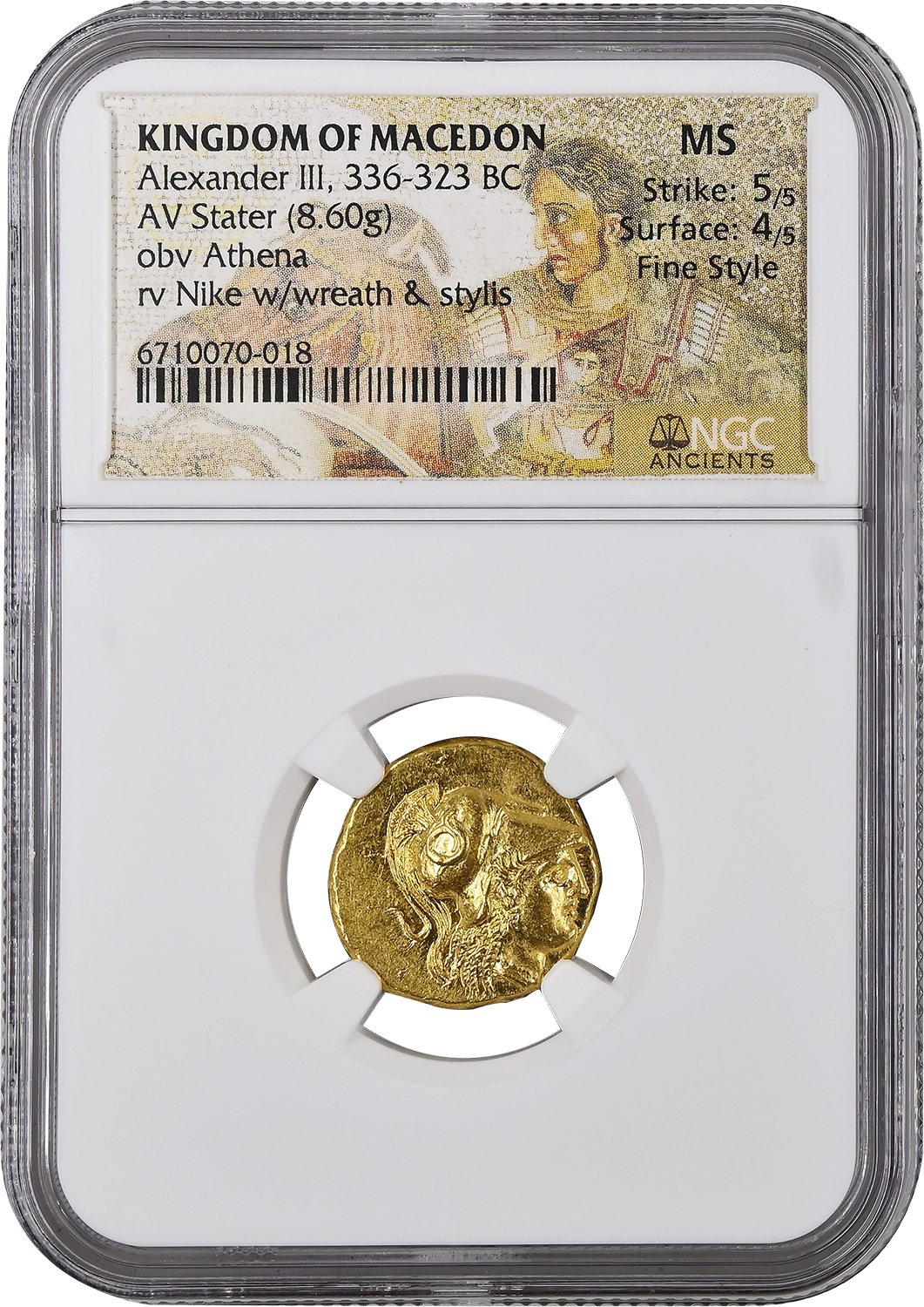 ALEXANDER THE GREAT GOLD STATER – LIFETIME ISSUE OF SARDES WITH RARE STAG HEAD SYMBOL – MINT STATE FINE STYLE NGC GRADED GREEK KINGDOM OF MACEDON COIN (Inv. 20931)